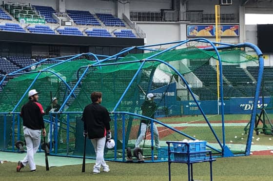 打撃練習は、吉井コーチと川越コーチが打撃投手を務める“超豪華版”。ストライクゾーンにボールが行かない時には、吉井コーチから「すまん!」と声が飛んだり、本塁打性の打球が飛んだ時に順番待ちで見ている他の投手陣からの歓声が上がるなど、終始なごやかな雰囲気で行われた。