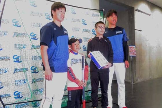 日本ハムの杉浦稔大投手と玉井大翔投手が27日、本拠地ソフトバンク戦を前に行われた野球少年少女応援プロジェクト「ネクスト・サークル」の用具贈呈式に臨んだ。