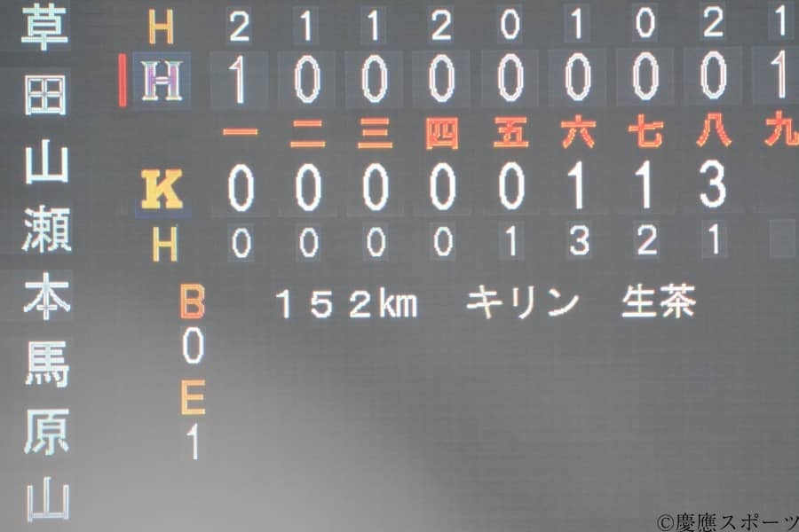 | 慶大 | 0 | 0 | 0 | 0 | 0 | 1 | 1 | 3 | X | 5 |