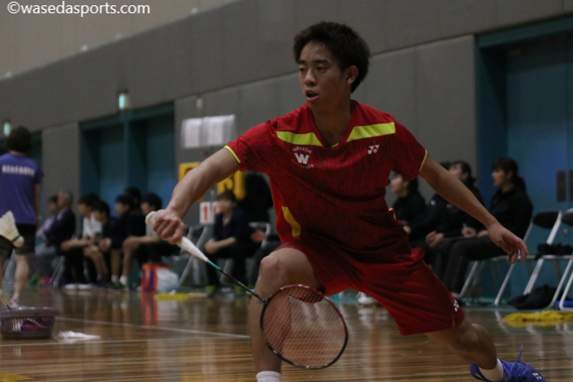 男子部の初戦は大林拓真(スポ2=埼玉栄)に任される。安定した強さで相手を圧倒し、危なげなく勝ち星をあげた。続くシングルス2には期待のルーキー緑川大輝(スポ1=埼玉栄)が登場。相手のミスから先制点を得ると一度もリードされることなく1ゲーム目を先取する。「先輩方が後ろで盛り上げてくださっていたので、シングルスに関してはリラックスして楽しくできた(緑川)」と語ったように、堂々としたプレーが見られた。2ゲーム目、11-9で試合を折り返すも、なかなか点差を広げられない。しかし、小さいながら体のばねを使った鋭いジャンピングスマッシュがコートにささり、着実に点数を重ね、21-19でゲームセット。勝利に王手をかけた。そしてダブルス1もフルセットを制し、初戦を白星で飾った。