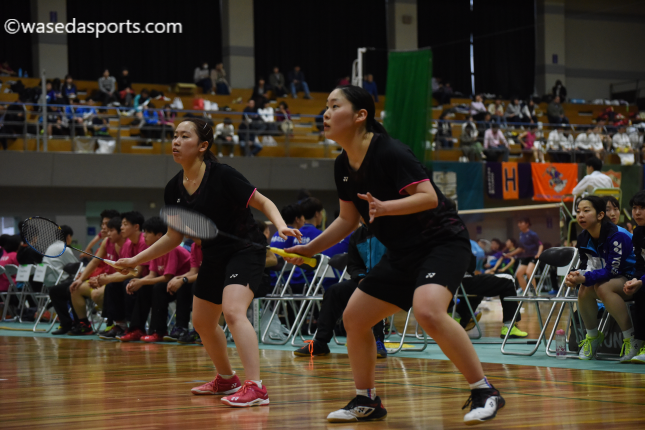 昨年度の関東大学秋季リーグ戦(秋リーグ)で6位になり、入れ替え戦でなんとか1部残留を決めた女子部。今大会で掲げた目標である「リーグ優勝」に向けて、まずは1勝をあげ順調に一歩踏み出した。1−2で迎えた第2ダブルスで、桃井伶実女子主将(スポ4=石川・金沢向陽)・平野紗妃(スポ2=福岡・九州国際大付)組が日体大の女子主将を擁するペアと対戦。1ゲーム目は途中7点連続得点し3点差まで詰め寄るも取りきれず、第2ゲームから勝負をかける。「コミュニケーションを取るようにしていた(桃井)」の言葉通り、流れが悪い場面でも積極的に声を掛け合う。息のあったプレーを連発して勝ち切り、最後は相手のシャトルがネットに吸い込まれた。桃井と平野の「勝ちたい」という執念が実り、このペアでのリーグ戦初勝利を飾った。その後、2−2で試合の命運を託されたダブルス高校女王のルーキー吉田瑠実(スポ1=埼玉栄)が苦戦を強いられるが、プレッシャーがある中なんとか勝ち切り、2016年秋以降初めてリーグ戦にて日体大から勝ち星を獲得した。