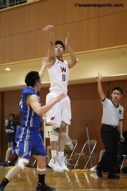 身長と選手層で優っている早大は、第1P(ピリオド)開始直後からスリーポイントと速攻によって、ハイペースで得点を重ねた。開始6分で20―7と大きくリードし、序盤から試合の主導権を引き寄せた。第2Pでも得点の勢いは止まらず、開始2分までにシュートを5本決めるなどし、11―0のランを展開する。中でも特に目立ったのがスリーポイントとリバウンドである。G柳川(スポ3=京都・洛南)、G土家大輝(スポ1=福岡・福大大濠)、F津田誠人(スポ2=京都・洛南)らが高確率でスリーポイントを決め、C小室悠太郎(社3=石川・北陸学院)、F宮本一樹(スポ2=神奈川・桐光学園)らがオフェンスリバウンドからの得点を重ねるなど、フロントコート、バックコートともに躍動。また前半で相手の得点を18点に抑えるなど得意とするディフェンスでも相手の攻めを封じ、攻守共に圧倒する展開となった。最終的には60―18と大きく相手を突き放し前半を終えた。