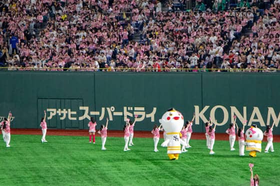 始球式に「劇団EXILE」の鈴木伸之さん、国歌斉唱にシンガーソングライターの川嶋あいさんという豪華ゲストを招き、試合開始。この頃には場内はピンク一色に染まっていた。