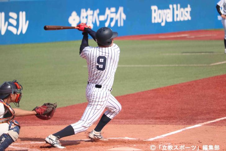 今日のスコアボードにはフレッシュな顔がそろった。スタメンのうち1年生が4人とこれまでと少しメンバーを変えて試合に臨んだ。初回から小野翔(社2=佐久長聖)の二塁打や2回の渡辺能(コ2=日大二)の二塁打でチャンスメイクをするも、あと一本が出ない歯がゆい状況が続く。反撃は6回、先頭の吉岡(コ1=広陵)の安打などでチャンスを作り一死満塁で迎えた渡辺。「何とかバットに当てた」と語る彼の打球は犠飛には十分。意地の1点を返した。しかし反撃の狼煙はくすぶったまま。無情にも試合は終了した。