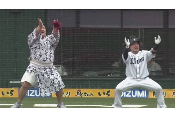 試合前に北勝富士関はマウンド手前から山川と“対決”。山川はフルスイングで応えたが結果は二飛に終わった。対決を終え西武の主砲は「お相撲さんの球は重かったです。絶対ホームラン打ちたいと思います」と完敗を認めリベンジを誓った。