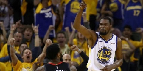 3連覇に挑むウォリアーズが、ロケッツとのカンファレンス・セミファイナル第5戦に104-99で勝利し、シリーズ突破に王手をかけた。しかし、チームで最も安定していたケビン・デュラントが負傷交代を余儀なくされる事態に直面した。