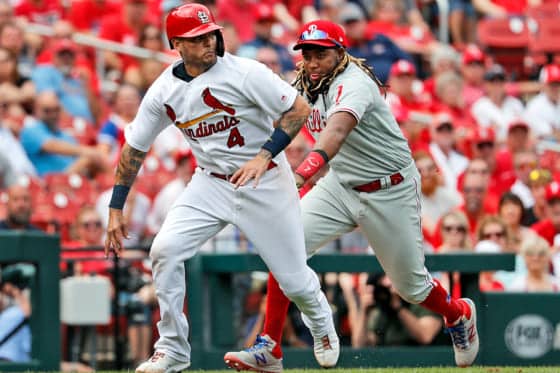 一、三塁からの挟殺プレーで三走のモリーナはマウンドへ……フィリーズ 5-0 カージナルス(日本時間9日・セントルイス) …