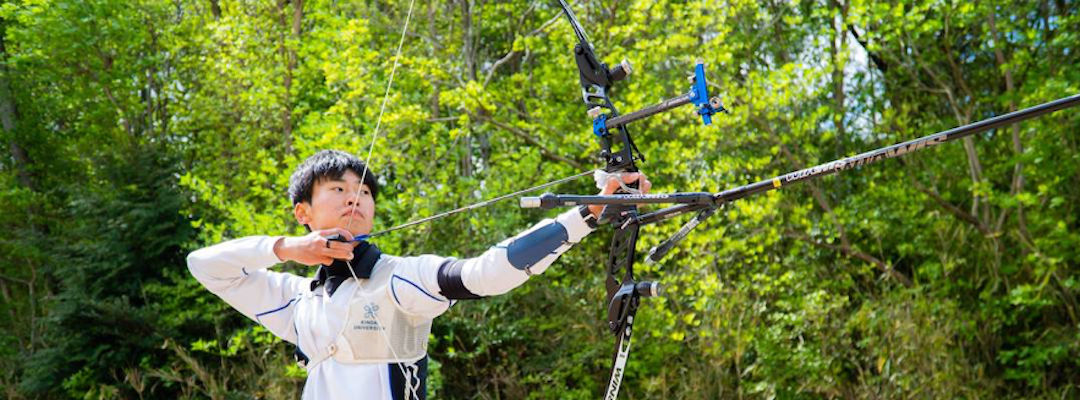 ただ、黄色い的の中心だけを見つめる。石川竜也選手(近畿大学)が弓を引き絞った。鋭く放たれた矢は、無駄のない弧を描き吸い込まれるように的に刺さった。アーチェリーは大きく「ターゲットアーチェリー」と「フィールドアーチェリー」に分けられる。山野に設置された的を狙うフィールドアーチェリーとは異なり、石川が取り組むターゲットアーチェリーは、屋内(インドア)もしくは屋外(アウトドア)の平らな場所に設置された的を狙う。アウトドアアーチェリーの場合は天候に左右されるため、より高度な技術が求められる。最も重要なのは緊張しないこと。緊張して余計な力が入れば、それがダイレクトに弓に伝わって結果に反映されてしまう。試合の時こそ普段通りを意識し、満点である10点を常に目指すことで、石川は好成績を残してきた。