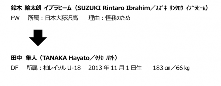 5月12日(日)より大阪府の「J-GREEN堺」でトレーニングキャンプを行う、U-16日本代表候補において、鈴木輪太朗イブラヒーム選手(日本大藤沢高)が怪我のため不参加となり、田中隼人選手(柏レイソルU-18)を招集することになった。