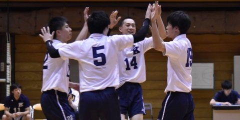 <写真・得点を決め、ハイタッチをする選手たち> 5月12日、京都産業大学にて2019年度関西大学バレーボール連盟春季リー…