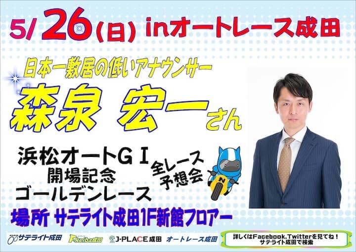 5月26日(日)にサテライト成田さん内にありますオートレース成田さんにて、私、森泉宏一による大予想会が開催されます!