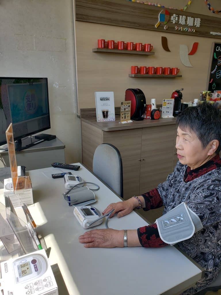 写真:卓球珈琲(カフェ)で血圧を測る女性/提供:朝日エル