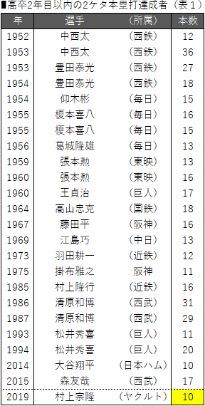 2リーグ制以降、高卒2年目以内に2ケタ本塁打を放ったのは史上18人目(表1)。それだけでも優れたものだが、チーム38試合目での10号弾は1953年の中西太を抜いて高卒2年目では史上最速。村上は2000年の2月生まれのため、史上初となる10代での本塁打王誕生も現実感を持って期待が高まっている。
