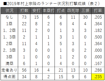 しかし、そう考えた時、まだまだ改善すべき点は多くある。一つ目が「得点圏打率」。村上の今季のランナー状況別打撃成績(表2)を見ると、得点圏打率.235(34打数8安打)に留まっている。