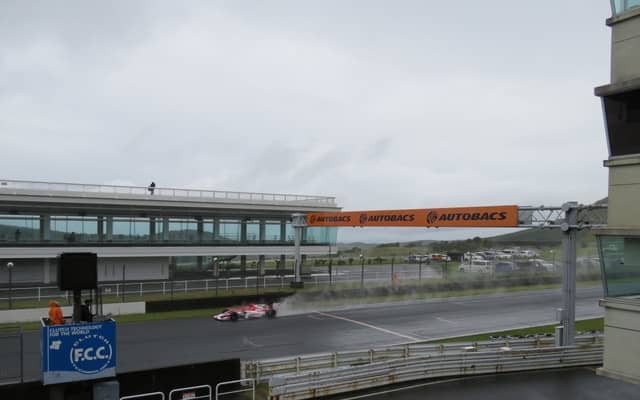 予選日、九州のほぼ真ん中(大分県内の“熊本県寄り”の立地)にあるオートポリスは予報通り雨に見舞われた。しかも風が強く、5月中旬とは思えないくらいに寒い。タイムスケジュールは天候状況に影響されることとなり、朝8時50分開始予定だったSFのフリー走行は30分遅れで(実質的には短縮されて)始まり、走り出してからも赤旗中断が2度あるなどして最後は予定時刻の前に終了、正味の走行時間は10分少々といったところに留まった。