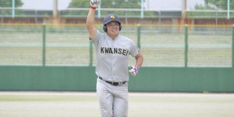 <写真・本塁打を放ち、ガッツポーズをする高尾> 5月18日、大阪府南港中央野球場にて2019年度関西学生野球連…