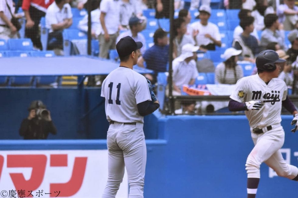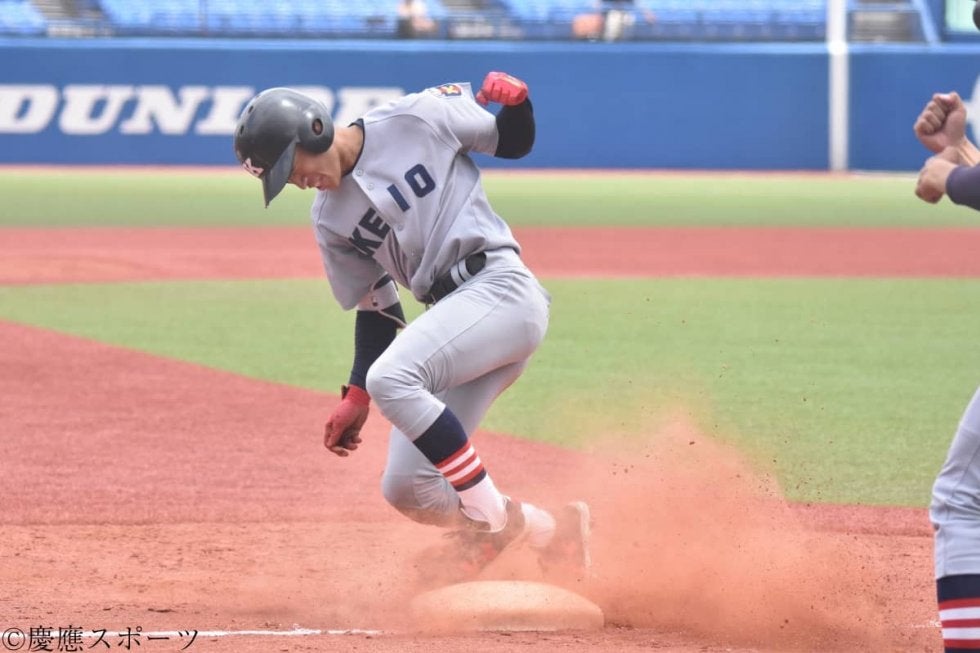 その後、増居翔太(総1・彦根東)など、リリーフ陣の踏ん張りがあり、流れは徐々に慶大に。すると6回、4番・郡司が二塁打で出塁。5番・正木は、三振に倒れるも、嶋田の代打・福井章吾(環2・大阪桐蔭)の適時二塁打で1点を取り、2点差に詰め寄る。その直後、守備交代で試合に入った6番・小原和樹(環4・盛岡三)が中前安打を打つ。その間、走者の福井は、二塁から激走を見せるも、明大の中堅手・丸山の好返球もあり、本塁でタッチアウト。1点差とはならなかった。それ以降も、攻撃陣は、走者を出すも、あと一歩のところで安打が出ない状況が続く。最終回は先頭の小原が出塁するも、後続が凡退し、ゲームセット。