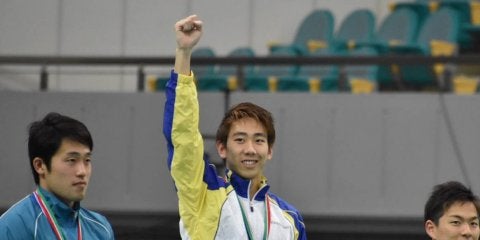 <写真・男子100メートル自由形の表彰式で歓声に応える平松> 5月19日、丸善インテックス大阪プールにて第7回関西学生チ…