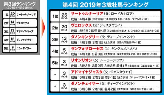 1位は、4連勝で皐月賞を制したサートゥルナーリア。第1回から首位の座をキープしてきたが、今回初めて満票となる25ポイントを獲得した。はたして、無敗のダービー馬誕生となるのか、期待は膨らむ。