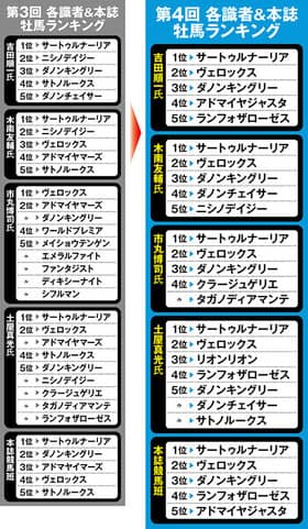 3位には、路線変更したアドマイヤマーズに代わって、ダノンキングリーが浮上。ヴェロックス同様、皐月賞で僅差の勝負を演じ、ダービーでも再度の奮闘が見込まれている。