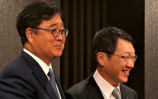 三菱自動車の益子現CEOと加藤新CEO《撮影 福田俊之》