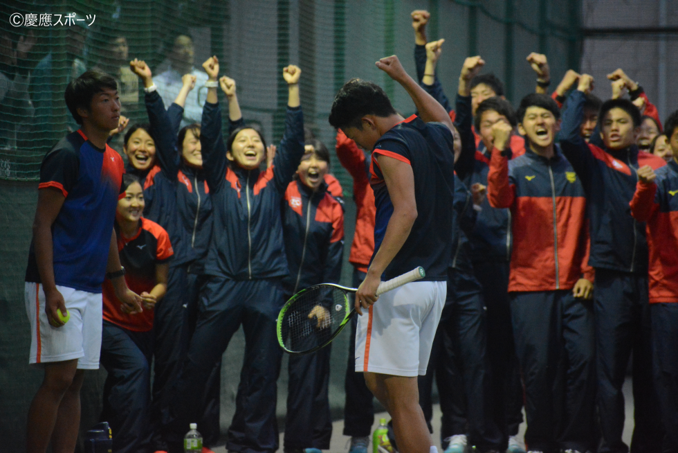 羽澤は今年も慶大のエースとしてS1で登場。相手は、去年の早慶戦でフルセットまでもつれる大激闘を繰り広げた島袋。先手を取ったのは島袋だった。キープキープが続く中、第7ゲームをブレイクし、ワンブレイクアップで第1セットを取ると、強力なサーブや、正確なパワフルなショットで試合を優位に進め、第2セットを連取。このまま島袋ペースで進むと思われたが、羽澤が第3セットで巻き返す。厳しいコースに放たれた重いショットやネットプレーで、ポイントを確実に重ね、タイブレークまでもつれた第3セットを7-6で取ると、そのままの勢いで第4セットも獲得。スコアをイーブンにする。勝負の最終セット、両校のエースのプライドが激しくぶつかり合い、激しいラリー戦が展開される。体力が激しく消耗している中、羽澤は最後まで集中力を切らさず、威力のあるショットとサーブで果敢に攻め続けると、最後は、島袋がローボレーをネットに引っ掛け、ゲームセット。羽澤は今年も5時間を超える死闘を制した。