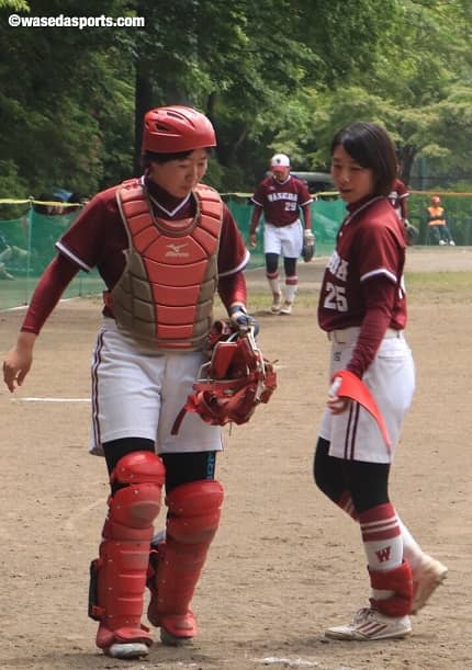 4回からは、投手のみならず捕手も今年の公式戦では初めて交代した。不動の正捕手である川崎からマスクを譲り受けたのはリーグ戦では主に3塁コーチャーとしてチームを引っ張ってきた河野友里(スポ4=東京・鴎友学園)。「廣瀬と川崎が流れを作ってくれた」と途中出場でも動じることなく冷静に伊藤をリードし、4、5回を無得点に封じてみせた。6回からは増田侑希(スポ2=香川・高松南)とバッテリーを組み、連続で2塁打を浴びて1点こそ失うものの、その後は傷口を広げられることなくアウトを重ねた。7回も無失点に抑えて試合を締めくくり、5-1で快勝。2回戦へと駒を進めることとなった。