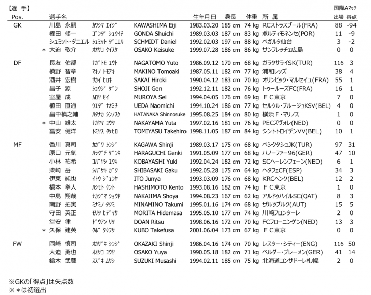日本サッカー協会が発表したサッカー日本代表メンバー