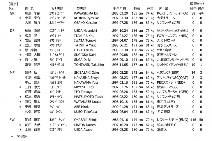 日本サッカー協会が発表したコパアメリカ日本代表メンバー