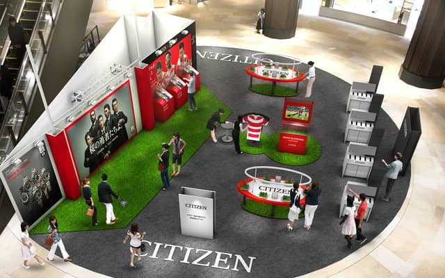 会場には、ラグビーグラウンドをイメージした空間を設置。SAKURAカラーをまとった「BRAVE BLOSSOMS Limited Models」やシチズン最新モデルを試着できるタッチ&トライコーナー、代表選手である田中史朗選手、山田章仁選手、姫野和樹選手へのインタビューを展示するコーナー、ラグビー日本代表のビッグユニフォームに代表選手たちに届ける応援メッセージを寄せ書きできるコーナーを用意する。
