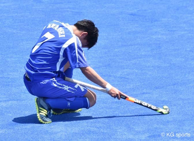 <写真・試合後、フィールドにしゃがみ込んだ為国> 5月25日、立命館OICフィールドにて2019年度関西学生ホッケー春季…