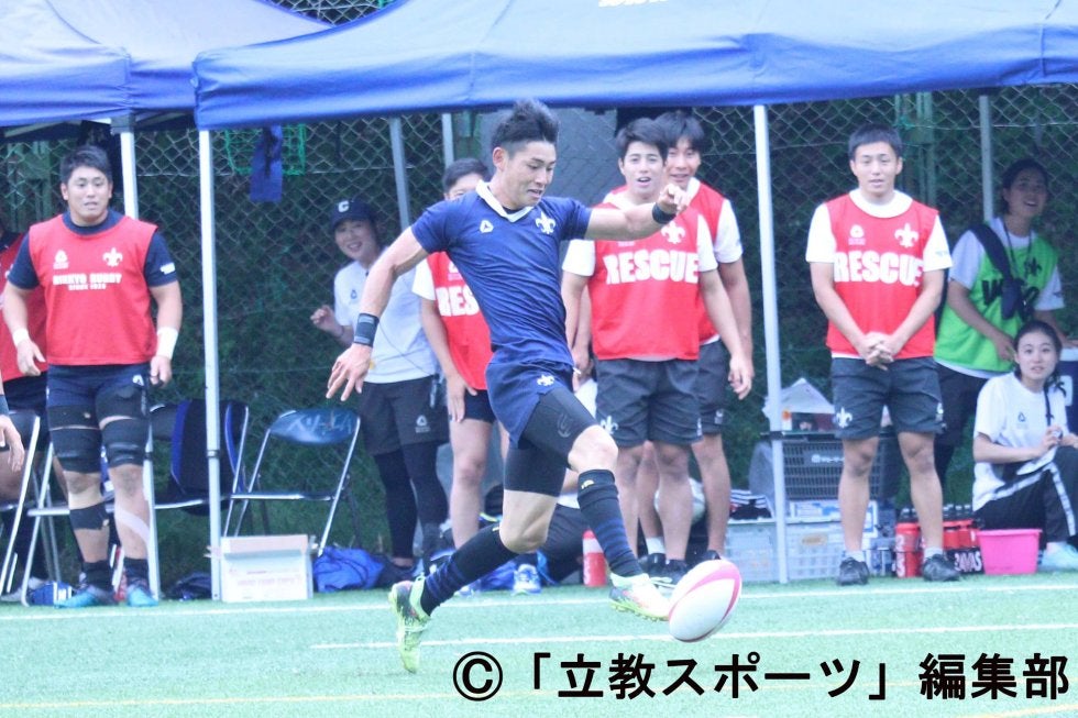 序盤は中大にボールを持たれる展開に。相手のSHがラックから持ち出し、FWのプレーヤーと連携を見せ、少しずつゲインラインを切る。自陣20メートル付近の中央ボールのスクラムからFWの縦攻撃を続け、BKにボールを回し左端にトライ。先制を許してしまった。その後も中央大学の縦攻撃に対して我慢の時間帯は続く。後半24分、敵陣立大ボールでのラインアウトからFWがボールキープをし、攻撃のタイミングを窺う。SO三村(観2)が左サイドに空いたスペースを見逃さなかった。中央から左サイドへキックパス。それをWTB山口航貴がキャッチしトライ。WTB楢崎(法4)のコンバージョンキックも成功し同点とする。