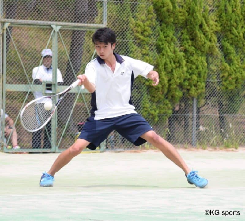 <写真・8強入りを決めた二階堂主将> 5月26日、同志社大学京田辺キャンパスにて2019年度関西学生ソフトテニス選手…