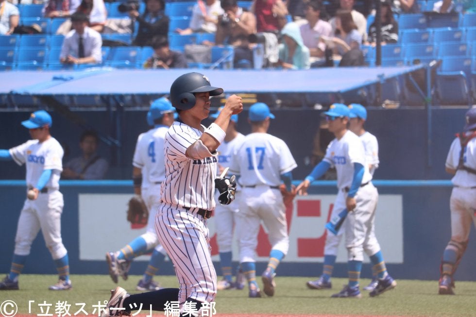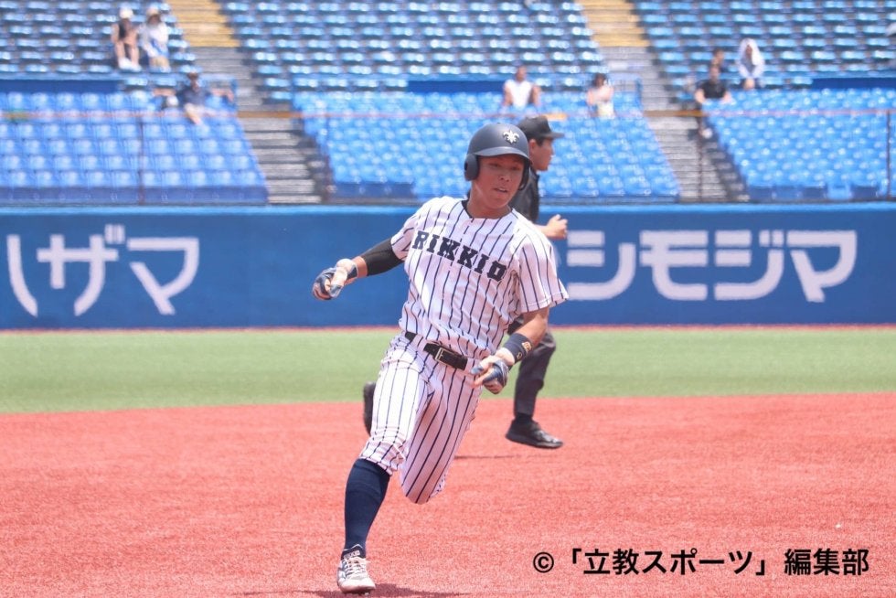 初回、先頭の宮﨑仁(コ1=大阪桐蔭)が三遊間への安打を放つ。直後に盗塁を決め、リーグトップの6盗塁をマークした。後続が倒れこの回は無得点に終わったものの、3回の2打席目でも左翼線への二塁打で1死二、三塁とチャンスメイク。19歳のフレッシュなリードオフマンが先制への足掛かりを作ってのけた。
