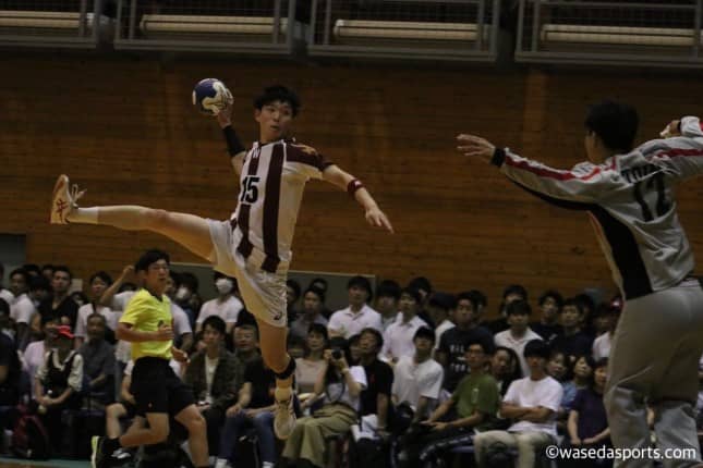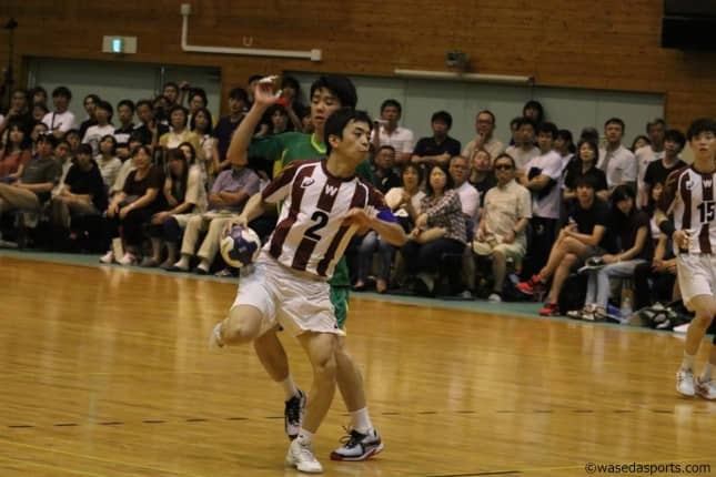 同点に追いつきたい早大は、序盤から着々と点を刻んでゆく。山本はキレのあるサイドシュートで相手に必死に食らいついていった。また、けがから復帰したCB青沼健太(社2=千葉・昭和学院)も相手ディフェンスを打ち破るシュートでチームに貢献。また、同点で迎えた23分、相手に7メートルスローを許してしまうというピンチに交代で入ったGK中村匠(スポ2=千葉・市川)がシュートを止め切り会場が盛り上がる場面もあった。しかし、早大は勝ちこしの1点がなかなか決まらない。両者一歩も許さず一進一退の攻防が続いていった。だが、残り時間2分となったとき相手選手にレッドカードがあがった。突然訪れたこの好機を逃すまいと、7メートルスローも含め前田が連続で2得点とし、25-24とついに1点をリード。残り1分を切った中での、この逆転は早大に勝利の二文字をもたらすはずだったが、敵もさるもの、残り10秒ほどで点を決めてきた。前田が必死にシュートを放ち、ボールは相手ゴールに吸い込まれたものの時間切れとなってしまった。