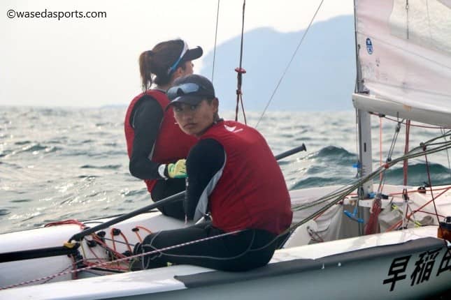 微風の中、1日目に3レース、2日目は5レース、計8レースが行われたハードな試合だった。関東春季学生選手権(春関東インカレ)で個人成績トップだった田中美紗樹(スポ4=大阪・関大第一)・新井健伸(商2=東京・筑波大付)組は今大会では4位。1日目は2位で折り返したが、第5レースでは思うようなスタートが切れず、25位。「5レース目からカットすることができるので切り替えて」(新井)続くレースに臨み、第7レースではフィニッシュ直前で慶大の船をかわしてトップを取る。だが5着でフィニッシュした最終レースでBFD(※1)を犯したと判定され、優勝を逃した。早大内2番手は倉橋直暉(スポ1=福岡・中村学園三陽)・吉村大(人4=埼玉・県浦和)組。第1レースで39位と大幅に出遅れたが、以降は3レース続けて一桁順位でフィニッシュ。第5レース、第6レースで17位、30位とやや順位を落としたが、最後は盛り返し、総合10位でレースを終えた。2日間通して終始安全圏をキープする上々の走りだった。