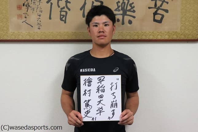 1997(平9)年11月6日生まれ。182センチ、85キロ。千葉・木更津総合高出身。スポーツ科学部4年。内野手。右投右打。加藤選手の色紙を見ながら「字うまいな〜」と笑みを浮かべる檜村選手が書いた言葉は『打ち崩す』。主軸として慶大投手陣を攻略し、早大に勝利を呼び込むことに期待です!毎試合球場に応援に来ているというご家族にもその勇姿を届けることでしょう!
