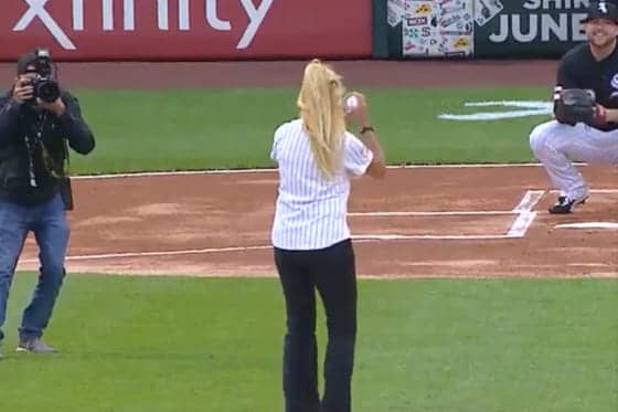 ホワイトソックス対ロイヤルズ戦で始球式を行った女性が大暴投(画像はスクリーンショットです)
