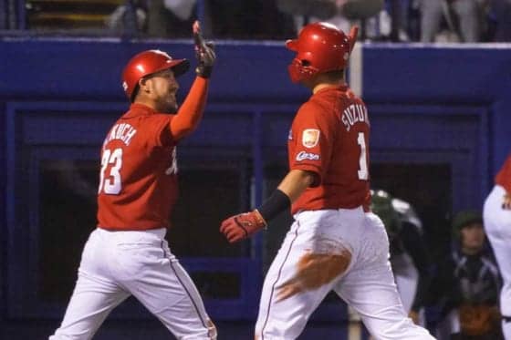 広島・西川の内野安打で生還した菊池(左)と鈴木【写真:荒川祐史】