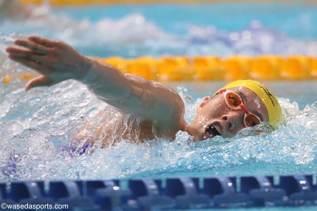 世界選手権日本代表選手の追加選考会も兼ねたジャパンオープンが開幕。海外選手も参加し、白熱した戦いが繰り広げられている。大会初日、早大勢からは佐藤千夏(スポ2=埼玉栄)が決勝へと駒を進め、4位に入賞した。実力を発揮し切れない選手も見られたが、男子100メートル平泳ぎでは大﨑威久馬(スポ2=神奈川・桐光学園)が大学入学後のベストタイムを記録。斎藤千紘(商1=東京・早実)も早稲田基準の突破はかなわなかったが、女子100メートル平泳ぎで自己ベストを更新した。