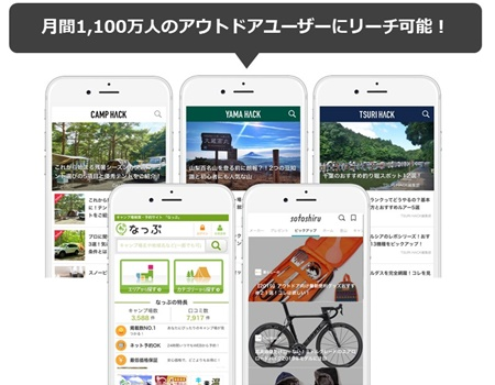 同社が運営する「CAMP HACK」をはじめとしたアウトドア好きが集まるWEBメディアを活用するため、多くのWEBメディアユーザーにアプローチできる。プロジェクトは、日本経済新聞「未来ショッピング」、中国新聞「カナエンサイ夢」など連携ネットワークサイトへの同時掲載も可能だ。また、キャンプ場検索予約サイト「なっぷ」の会員データベースを活用し、メールマガジンを使用した集客ができる。