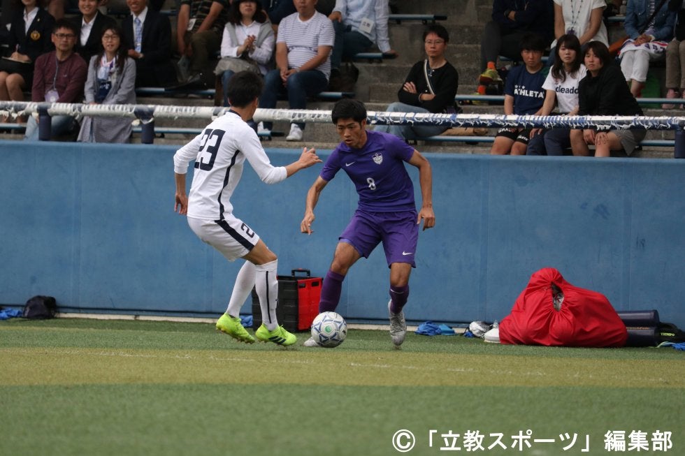 勝ち点を並べ順位を争う大事な一戦で、先制点を奪ったのは国士大。開始10分にパスカットを取られ、ミドルシュートで得点を許した。しかしわずか10分後、佐藤誠(社4=前橋育英)が右サイドからドリブルで上がるとゴール前に折り返し、桐(コ2=日大藤沢)が合わせ同点に追いついた。