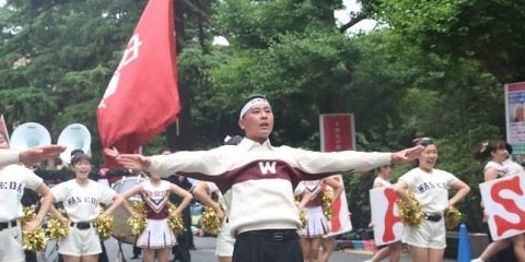 早慶戦を週末に控えた水曜日の昼休み。夏が感じられる快晴の下、早稲田キャンパス3号館前にて、慶応大学応援指導部との早慶…