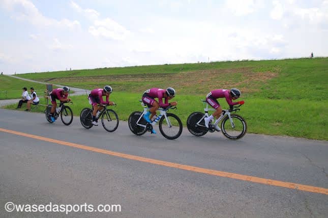 日本一の流域面積を誇る利根川の上流域にてチームロードタイムトライアル(チームTT)が行われた。チームTTでは各大学4名が特設コース63.2キロメートルを走り、3人目がフィニッシュしたタイムを競う。早大からは中川拳主将(スポ4=北海道・帯広三条)、小野寛斗(スポ3=神奈川・横浜)、山本真寛(スポ3=青森・八戸工大第一)、河野翔輝(スポ2=奈良・榛生昇陽)が出走した。途中3人がパンクするなどアクシデントに見舞われたこともあり、最終的に16位でのフィニッシュとなった。