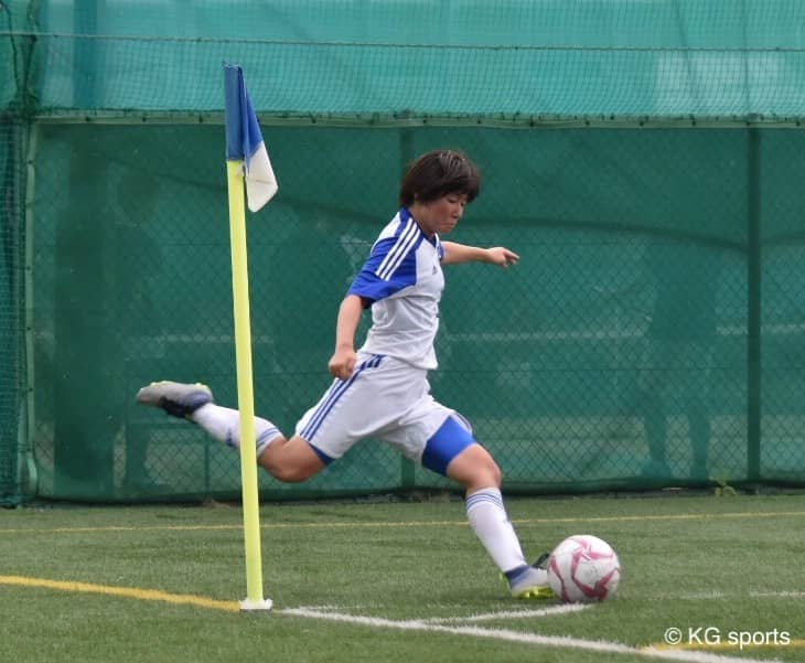 <写真・コーナーキックを蹴る馬場> 6月2日、追手門学院大学グラウンドにて、2019年度関西学生女子サッカー春季リーグ戦…
