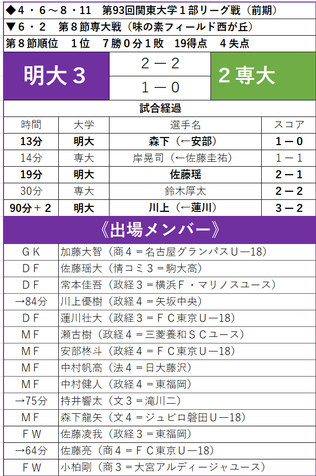 第8節は昨季同大会で大敗を喫した専大との一戦。前半13分に先制点を決めるも直後に失点し、点を取り合う展開に。2―2で迎えたアディショナルタイム2分には途中出場の川上が決勝弾を放ち、3―2で試合終了。苦しみながらも勝ち切る強さを見せた。