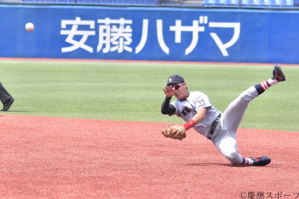 試合開始からエンジン全開の両軍先発投手が投手戦を繰り広げた。試合が動いたのは3回裏。前日3安打の瀬戸西純(政3・慶應)が9球粘って早大・早川の速球を右前へ運び出塁すると、続く髙橋佑が初球で犠打を決める。2死二塁の場面で、この早慶戦からスタメンに抜てきされた下山が左前へ適時打。無駄のない、効率の良い攻撃で先制する。その直後4回表の守備では、髙橋佑がこの試合初安打を浴びるも、続く打者の右中間を抜けようかという当たりを右翼手・中村健人(環4・中京大中京)がダイビングキャッチ。相手の反撃を許さなかった。