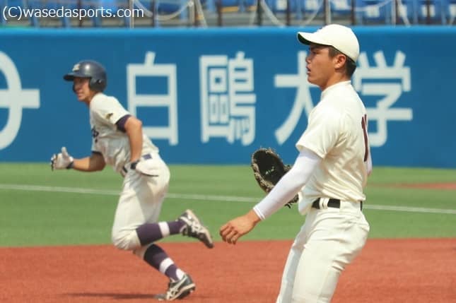 すると5回、2番手・山下拓馬(法2=埼玉・早大本庄)が 、流れを変える投球を披露した。先頭打者を三振で抑えるなど、この試合初めて相手打線を三者凡退に封じる。そしてその裏、先頭の小西優喜(文構2=東京・早実)が左前打で出塁すると、一気に反撃ムードが漂った。しかしここで痛恨のミスを犯してしまう。小西が二盗を試みた際、途中出場の打者・中岡凛太郎(スポ2=東京・早実)が空振り三振に倒れる。その時、空を切ったバットで相手捕手の二塁送球を妨害してしまったのだ。このプレーで一気に2死走者なしとなり、好機がついえた。しかし反撃に出たい早大は6回。岩本久重(スポ2=大阪桐蔭)が直球をさばき、右前打を放つ。続く打者は左飛に倒れたものの、7番・澤田健太朗(文2=福井・高志)が左越え適時二塁打を放ち待望の得点を挙げた。また8回にも、1死一、三塁の好機で代打・福嶋壮(社2=東京・早実)から適時打が飛び出し、いよいよ1点差に迫る。しかし次打者が併殺に倒れ、あと一本を生み出すことができなかった。すると9回、さらに1点を失った早大は、それ以上巻き返すことがかなわず。そのまま試合は終了した。