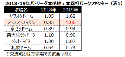 参考までに、2018・19年のパ・リーグ本拠地球場における本塁打の出やすさをパークファクターで示したのが表1だ。