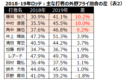 特に中村奨吾や角中勝也といった中距離ヒッターの外野フライ割合が大きく上昇しており、キャリアハイのペースで本塁打を記録。彼らを筆頭にロッテの選手は、総じて狭くなった本拠地球場に適した打撃スタイルへ変貌を遂げており、本塁打の増加に拍車をかけている。